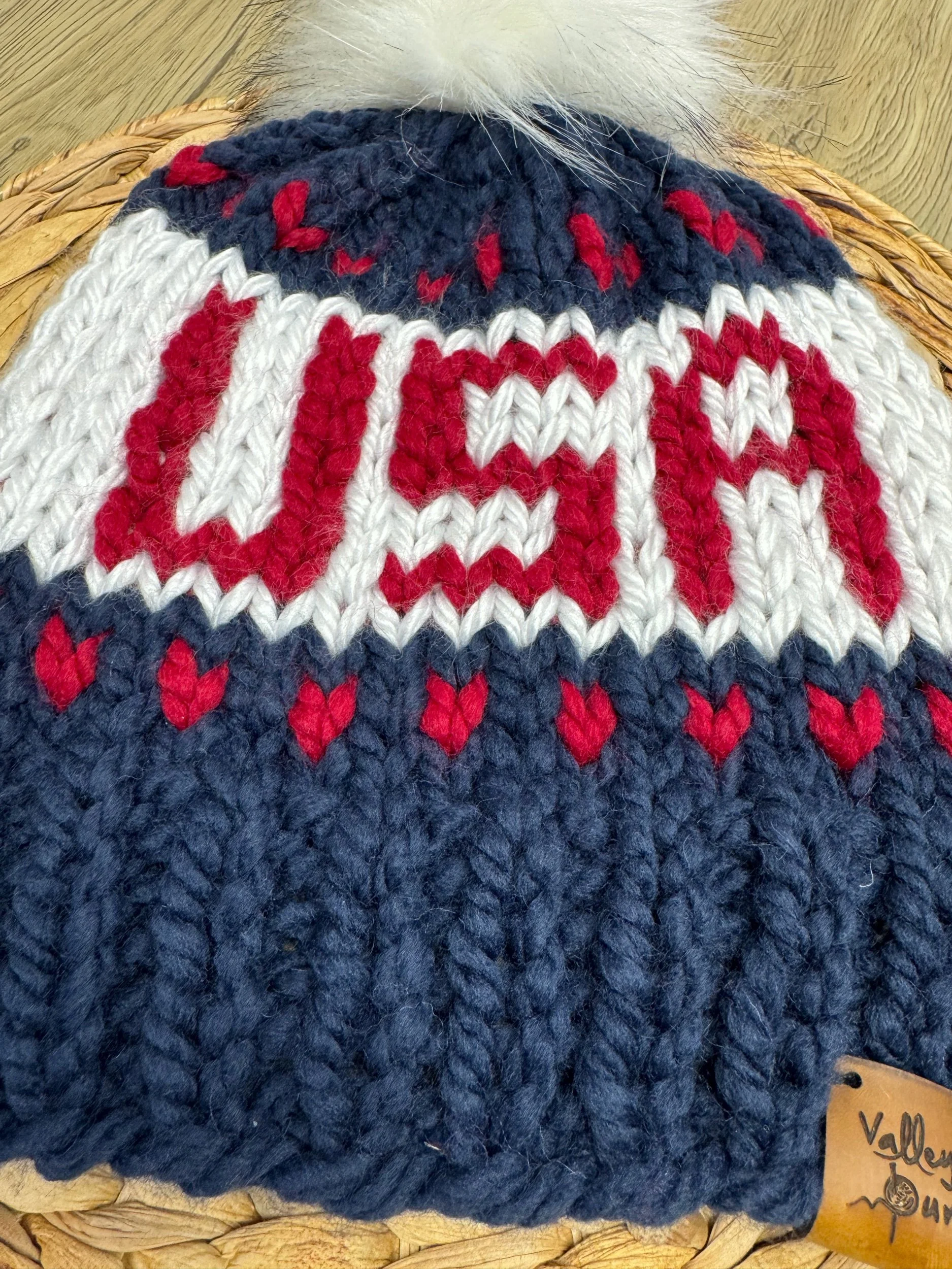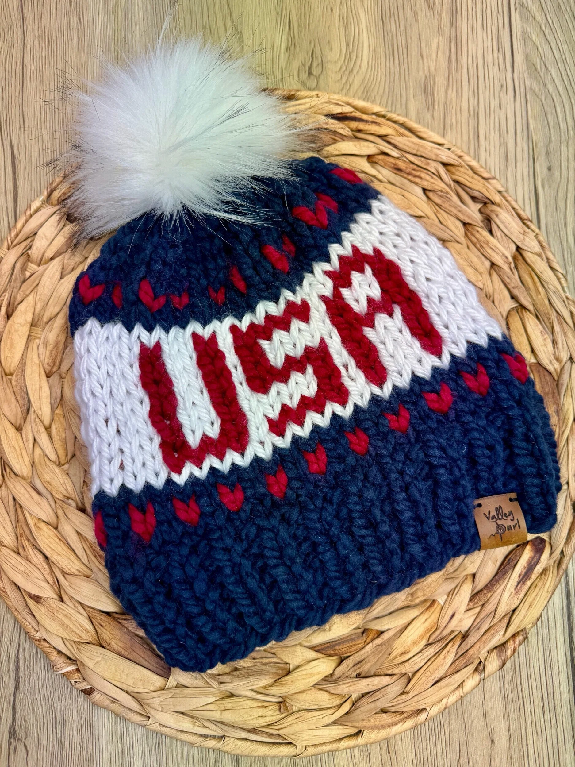 Hand knit USA beanie. Made with a soft wool/acrylic blend yarn. Finished with a leather brand tag and removable faux fur pom pom. Fits average adult sized head.